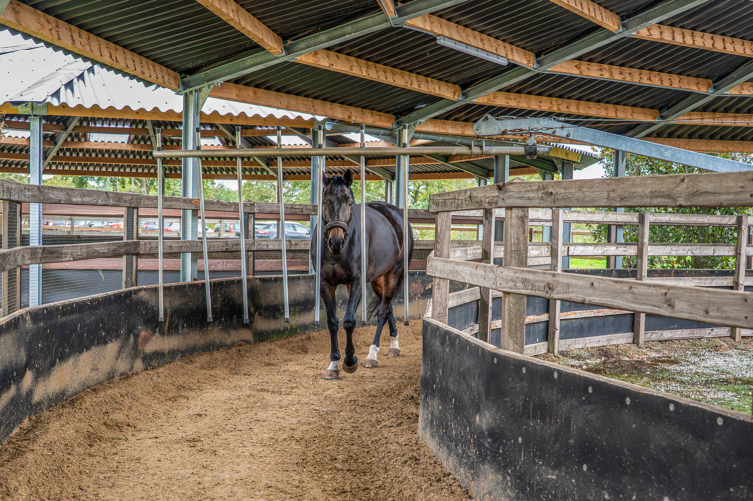 - Overdekte longeerbaan (18 m doorsnee) met eb- en vloedbodem